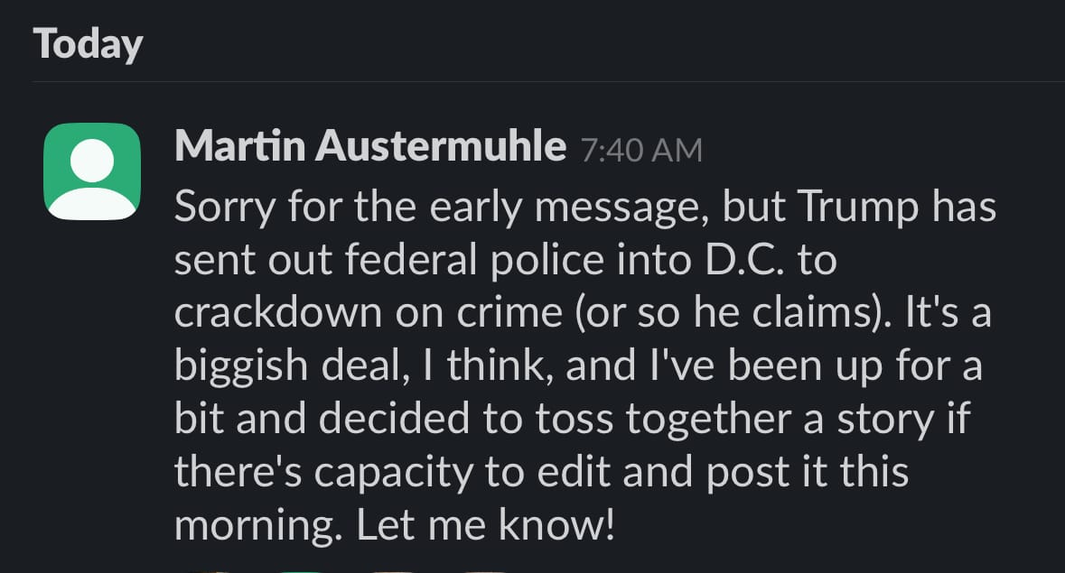These two journalists are crucial not just to The 51st, but to our city. Take this morning, for example. Before many of us had poured a cup of coffee, Martin wrote 1,600 words on Trump's new order to deploy federal police in D.C. – covering this story with the unrivaled context and analysis that only a reporter with his encyclopedic knowledge of D.C. could deliver. Christina jumped in within minutes to edit him and get the story on our site.