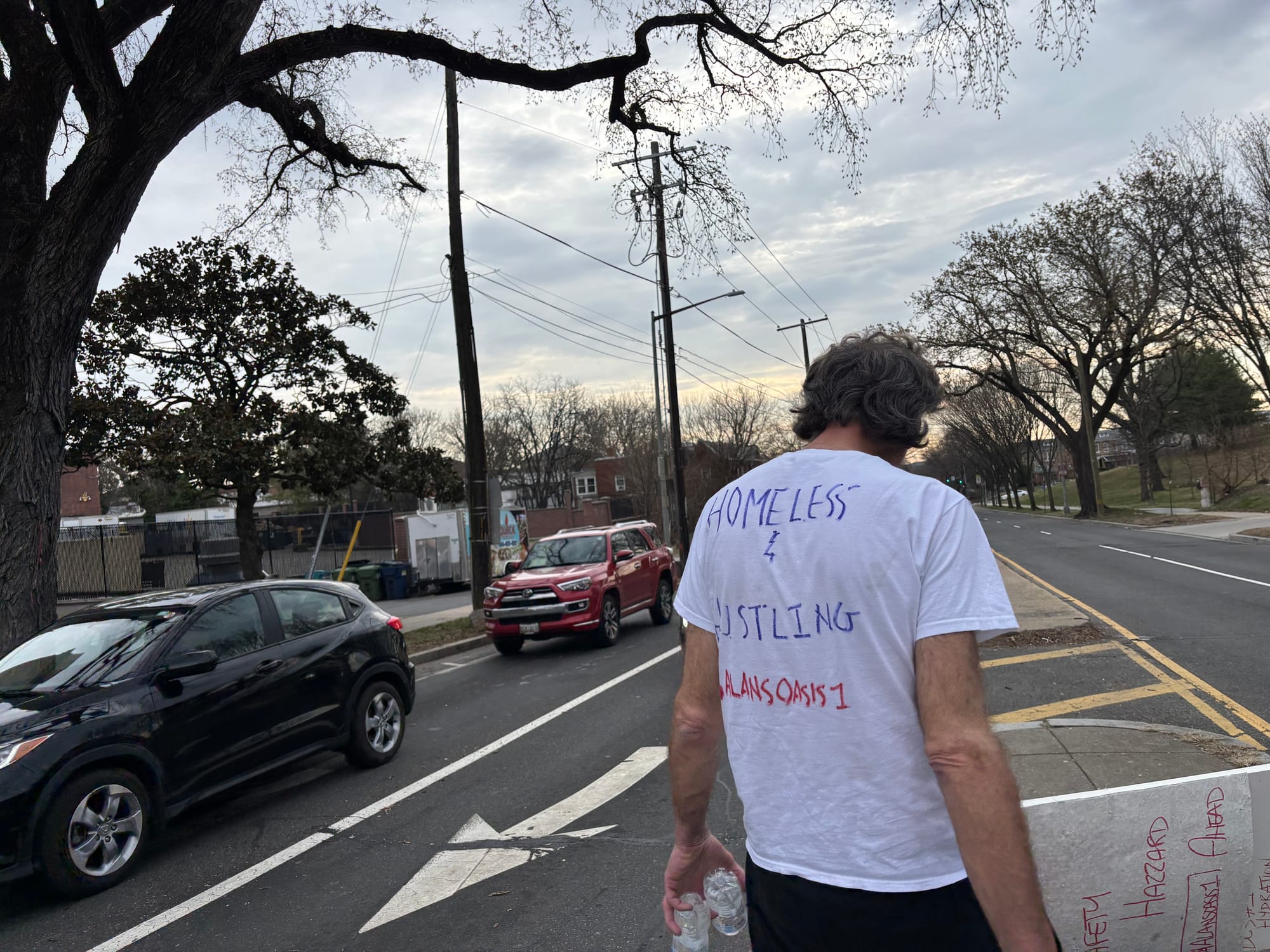 On the day of the closure, Alan took off his usual attire — a shirt that reads “Alan” on the front and “homeless and hustling” on the back. He wrote “Safety Hazard” in big lettering across the front of a new shirt and put it on.