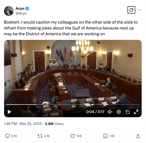 And this week in: “That’s brain-meltingly dumb even for you!” Beetlejuice vaper Rep. Lauren Boebert wants to rename the District of Columbia to District of America, because she thinks the “C” in D.C. stands for Colombia the country, not Columbia like … Christopher Columbus.