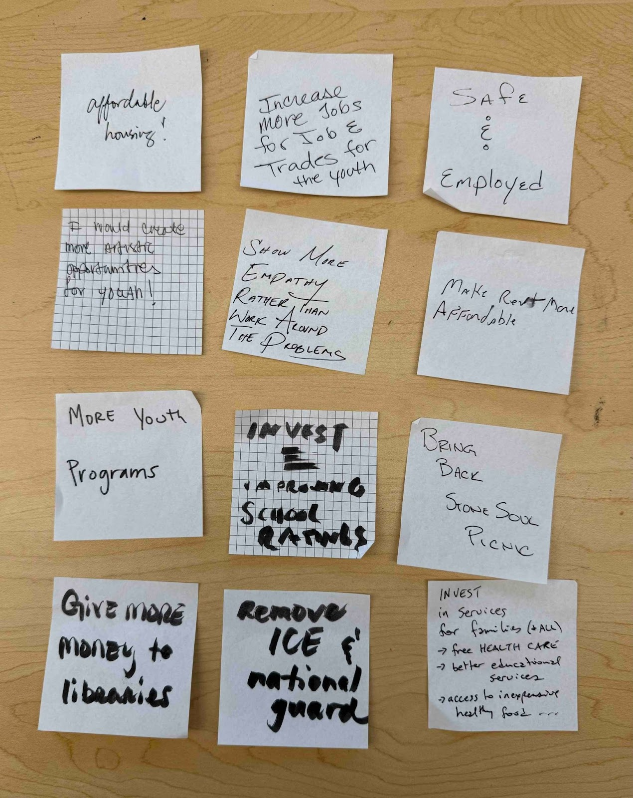 But folks also shared what’s missing. Jobs topped the list, with a call for more training for trade jobs for young people. Residents also wanted more youth programming and affordable rent and housing, and voiced concerns about ICE enforcement and the presence of the National Guard.