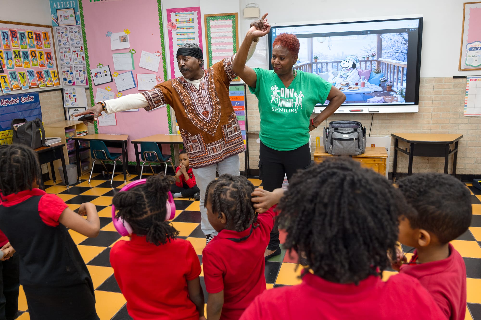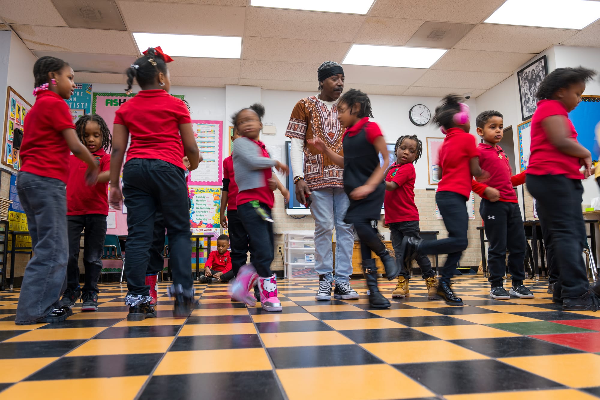 Kevin Fitzhugh and Kim Frazier teach hand dancing to Roots Public Charter School students in Northwest D.C. (Shedrick Pelt)
