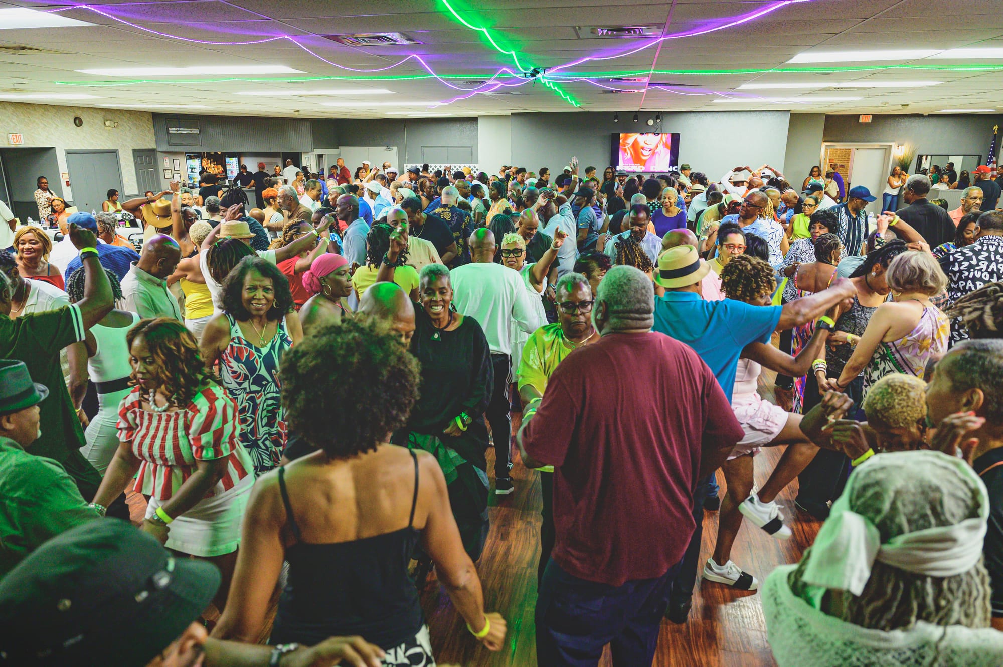 Left: Kevin Fitzhugh and Kim Frazier demonstrate a turn for the Roots Public Charter School students. (Shedrick Pelt) Right: People attending a 2025 hand dance day party at the Elks Lodge in Temple Hills, Maryland. (Charles Matthews)