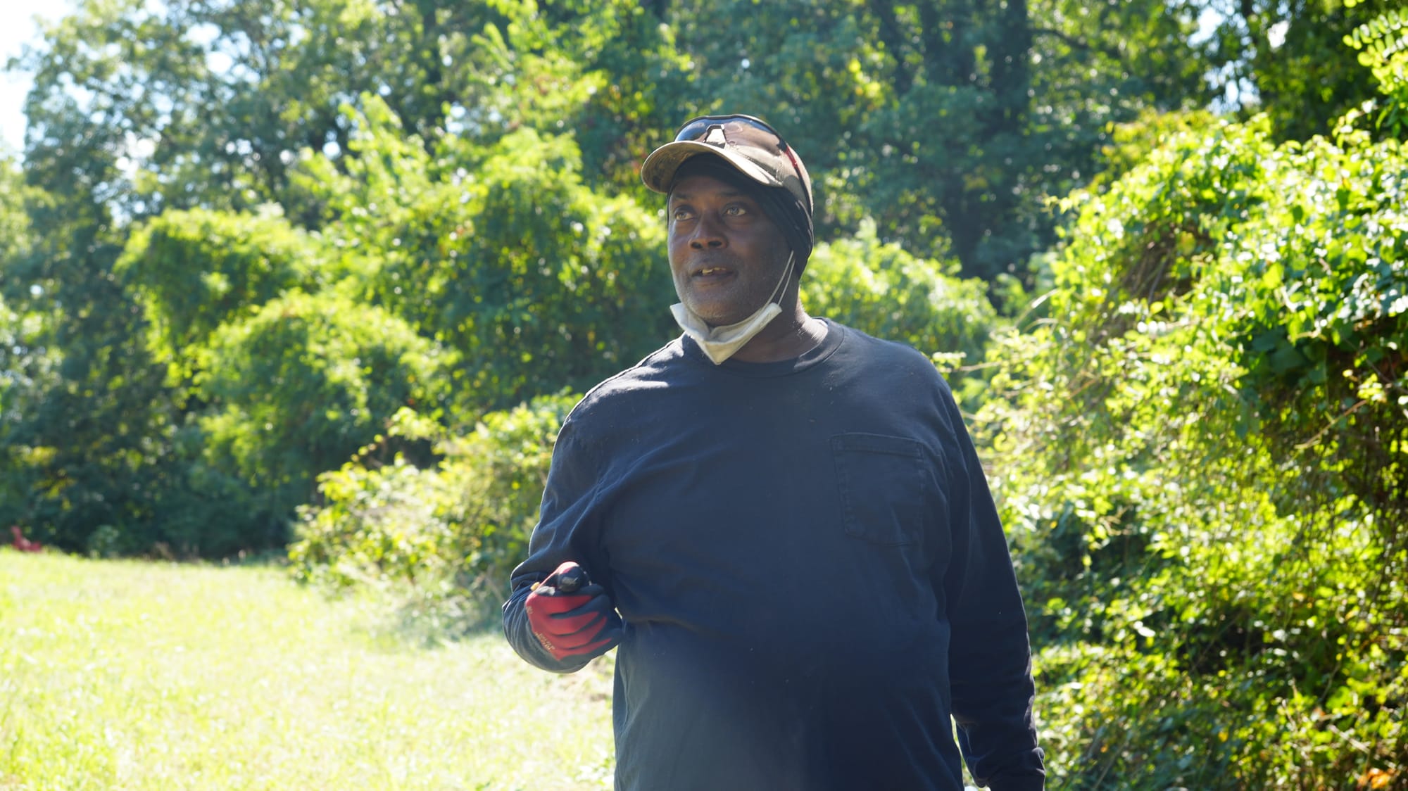 “I worry about climate change,” says Brian Gugerty, a volunteer. “But when I cut vines and save one tree, I worry less.”