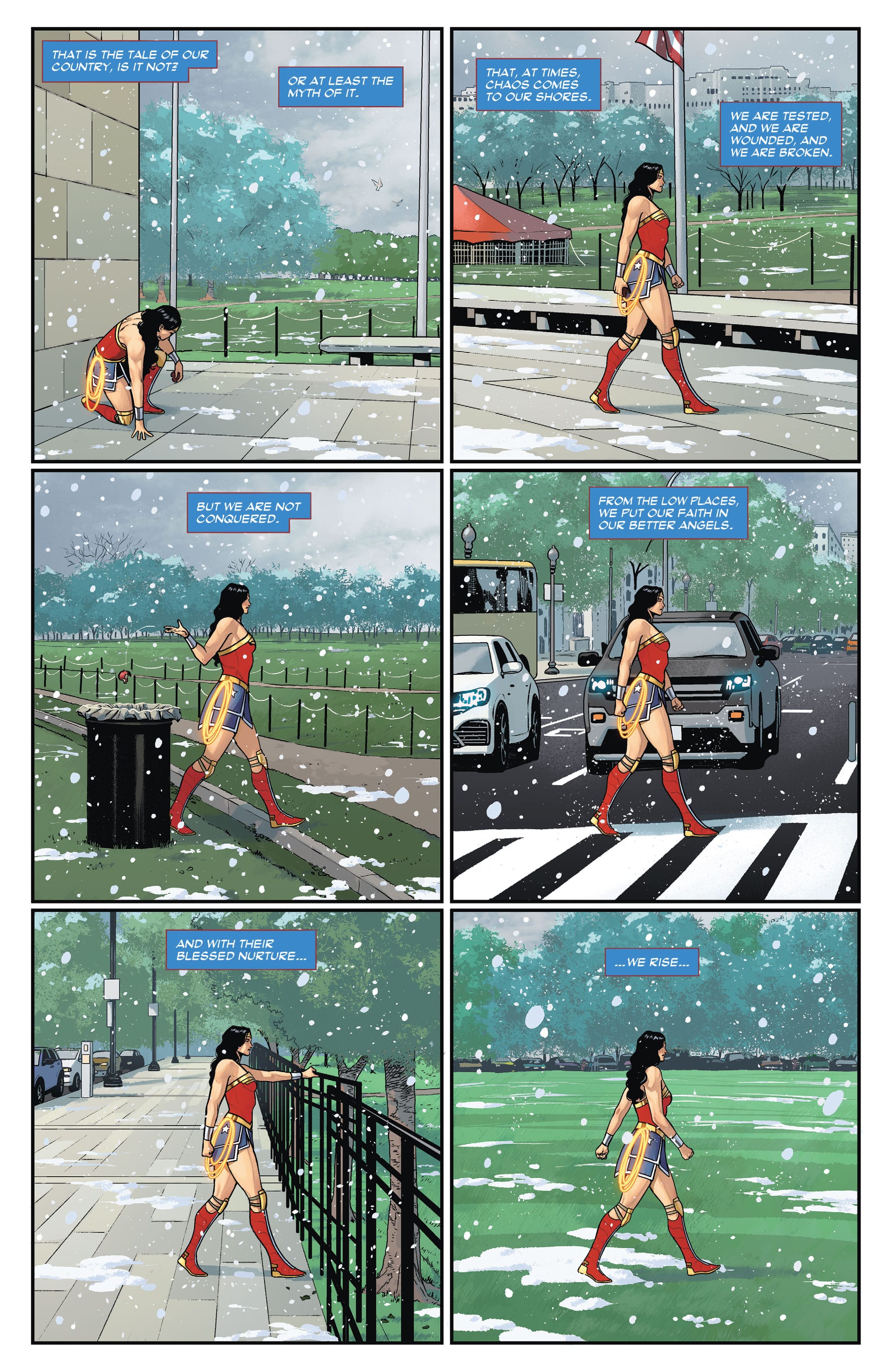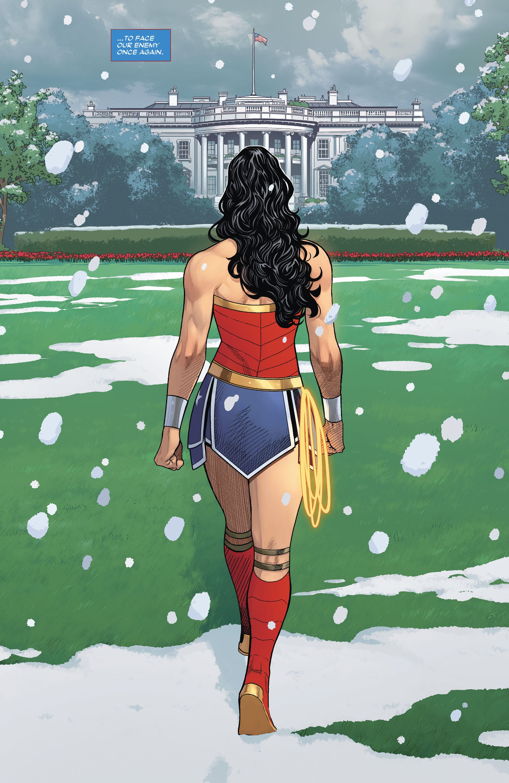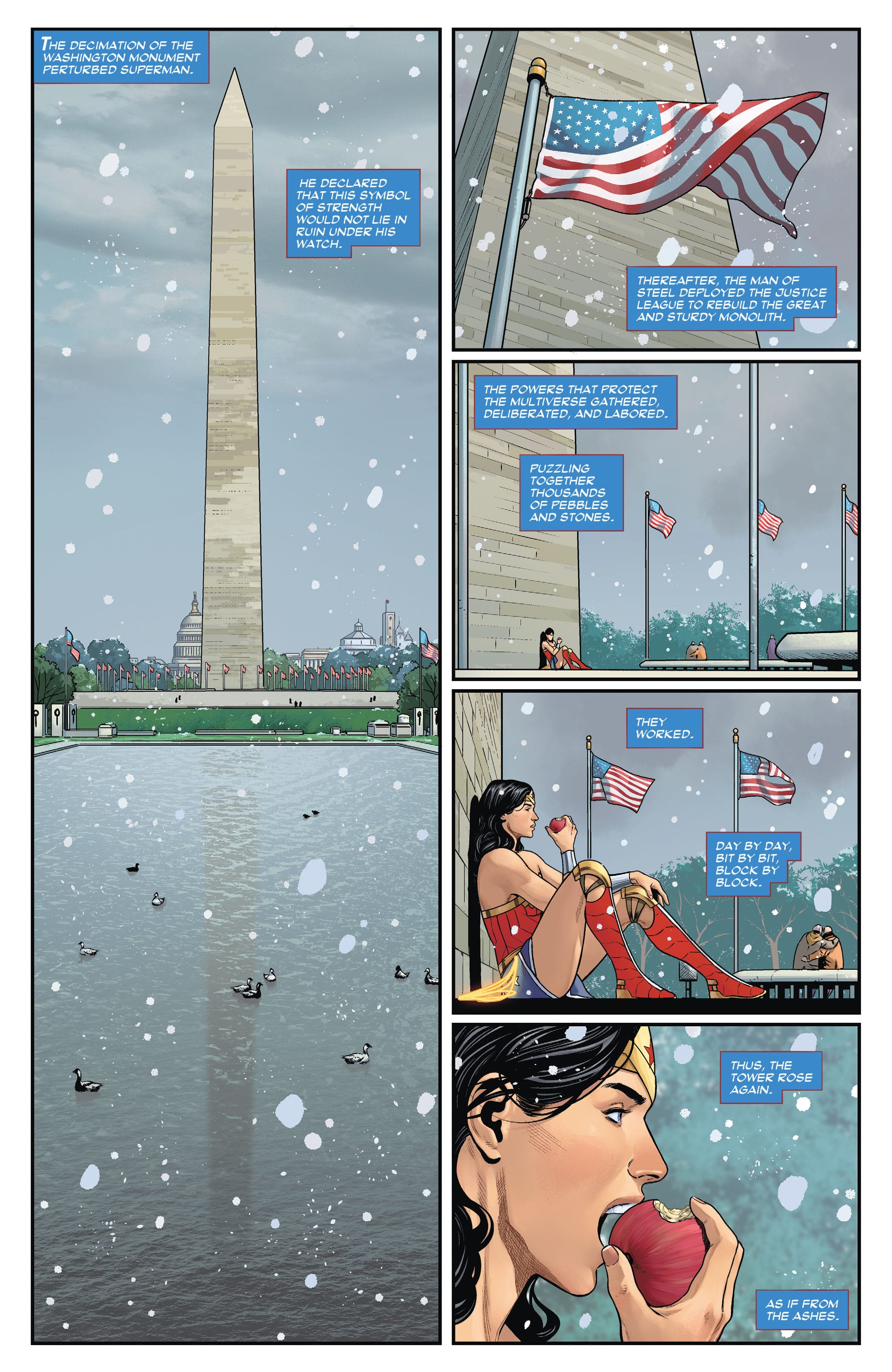 “When my kids were little, I would tell them these stories that there was a huge giant that was buried underneath the Washington Mall, and his foot was in the Lincoln Memorial and his nose was where the Washington Monument was, his hand is where the White House is,” he says. “They loved this story, and so when I wrote this huge Wonder Woman battle where she had to fight a giant, I buried the giant under the mall.”