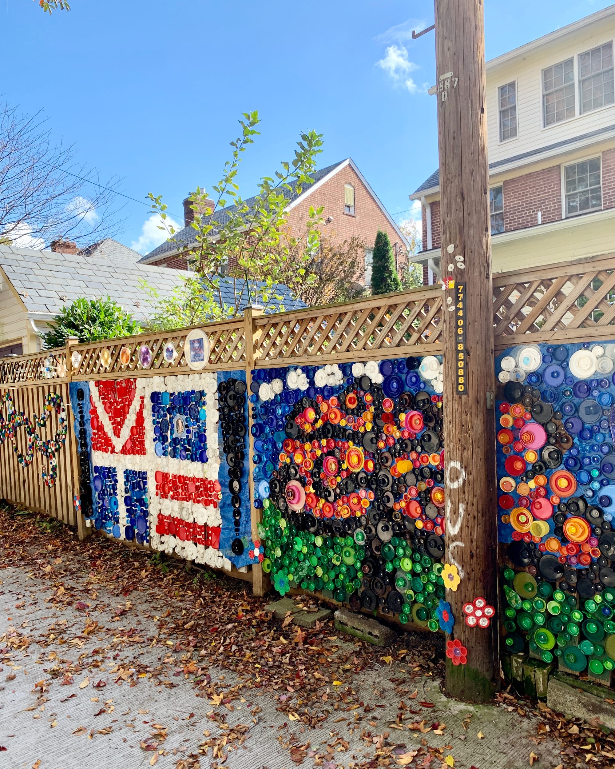 Down an alley in Tenleytown are murals made from plastic bottle caps. There’s a rainbow, a “Tree of Life,” a red, white, and blue one that reads “Vote,” and a portrait of the late Supreme Court Justice Ruth Bader Ginsburg. The murals’ goal is to help educate the city about plastics and recycling.