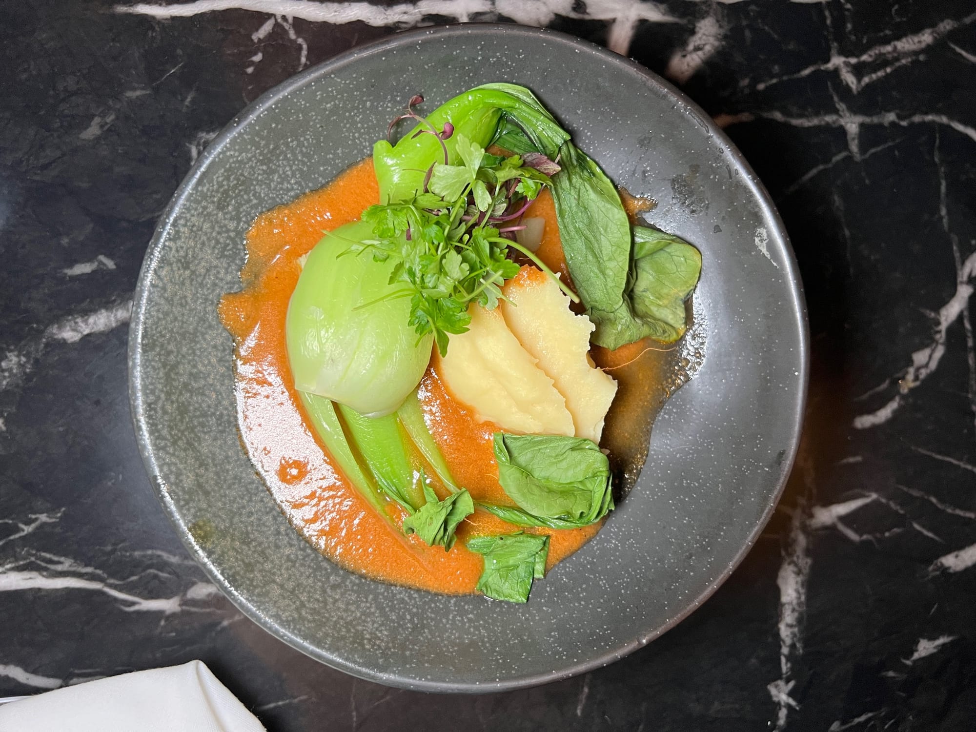 Adjepong is also using the menu to help change the perception of fine dining. For example, the menu includes fufu. Ghanaian fufu is a mix of root vegetables like potatoes, plantains, and yams that are laboriously pounded and kneaded into a smooth, round, doughy ball typically bathed in a meaty soup. It can be found in many restaurants in Ghana, but often not on contemporary dining menus in the West. But Adjepong disagrees with that precedent.